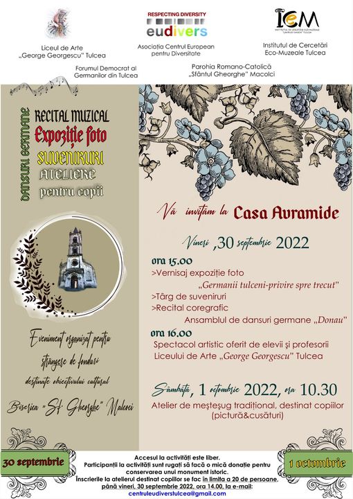 Vineri, pe data de 30 septembrie 2022, începând cu ora 15.00, Casa Avramide va găzdui vernisajul expoziției foto „Germanii tulceni- privire spre trecut”, un târg de suveniruri (realizate de voluntarii EUdivers) și un recital coregrafic al Ansamblului de dansuri germane „Donau” din cadrul Centrului EUdivers. Expoziția foto va include print-uri după exemplare din colecția Gotthold Schon, puse la dispoziție Parohiei Romano-Catolice „Sfântul Gheorghe” de către Asociația Germanilor Basarabeni dar și noi reproduceri după fotografii puse la dispoziție de reprezentanți ai Forumului Democrat al Germanilor din Tulcea. Începând cu ora 16.00, în incinta Muzeului Casa Avramide se va desfășura un spectacol organizat de Liceul de Arte „George Georgescu” din Tulcea.